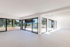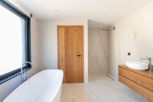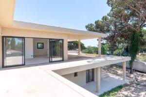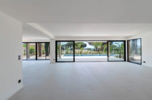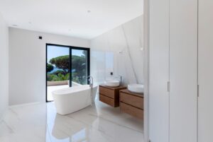 Finitions haut de gamme : carrelages Porcelanosa, robinetterie Hansgrohe, climatisation réversible, domotique, portail motorisé et système de sécurité